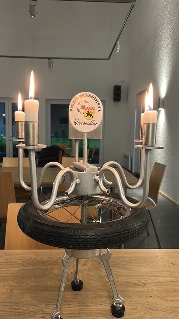 nach jeder Ausfahrt und erfolgreichem Kick erfreuen sich die Vereinsmitglieder am selbst gebauten Kerzenständer mit Radfahreroptik.